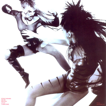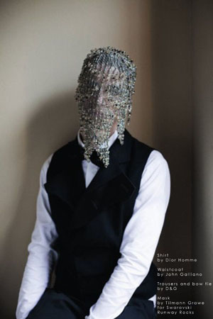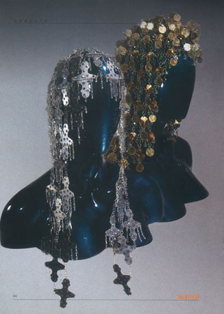 Headgear made out of black plexi and a black bustier decorated with discs made out of plexi