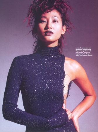 Evening dress made out of silk crêpe with a bustier made out of plexi and crystal