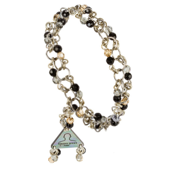 – Onyx stone – Swarovski Crystal – Color: Golden Shadow, Black Diamond – Stainless-steel chain – Labeled with logo in mother-of-pearl – Finishes are hand-made in France