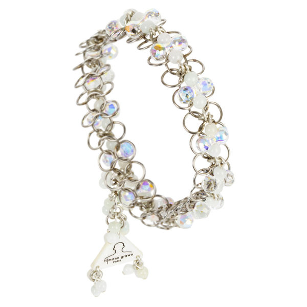 – Birmanian Jade stones – Swarovski Crystal – Color: Crystal Aurore Boreale – Stainless-steel chain – Labeled with logo in mother-of-pearl – Finishes are hand-made in France
