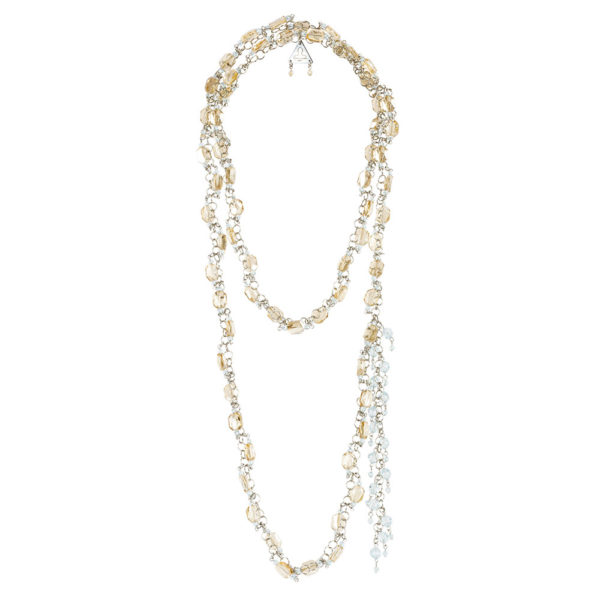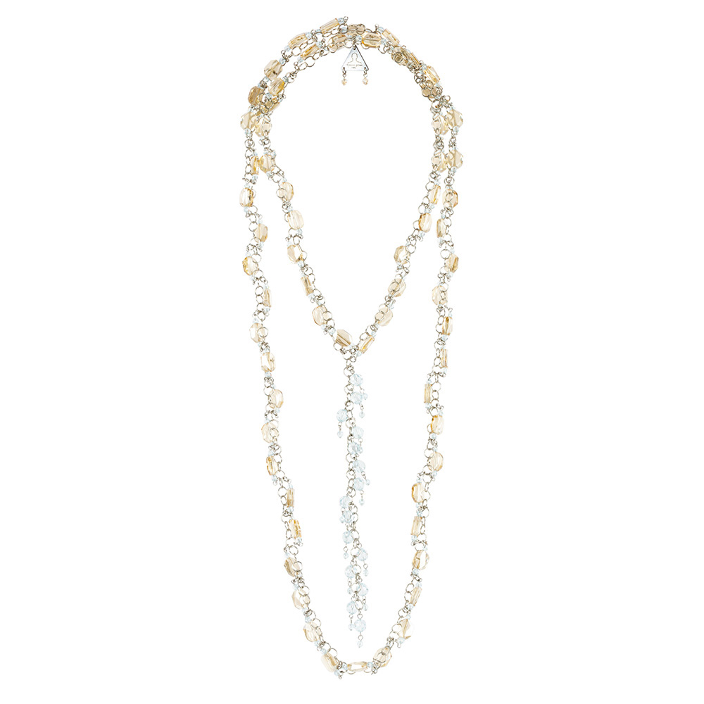 – 100 % Swarovski Crystal – Color: Golden Shadow, Light Blue – Stainless-steel chain – Labeled with logo in mother-of-pearl – Finishes are hand-made in France